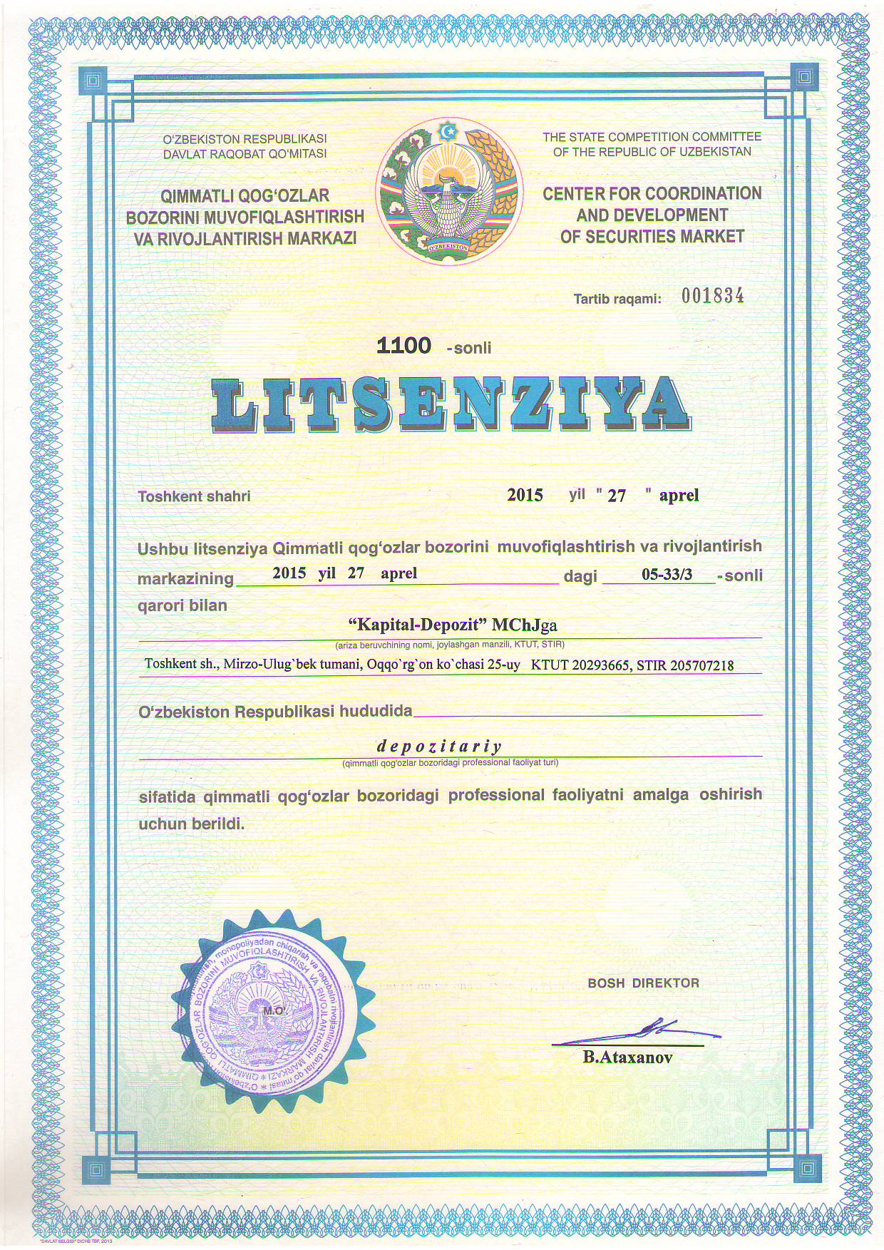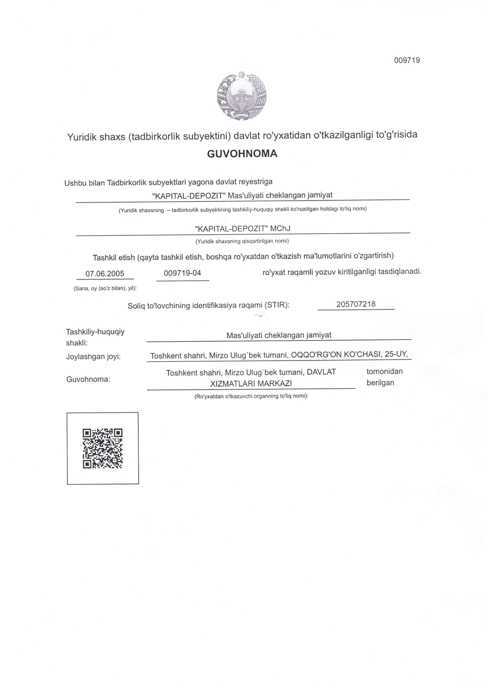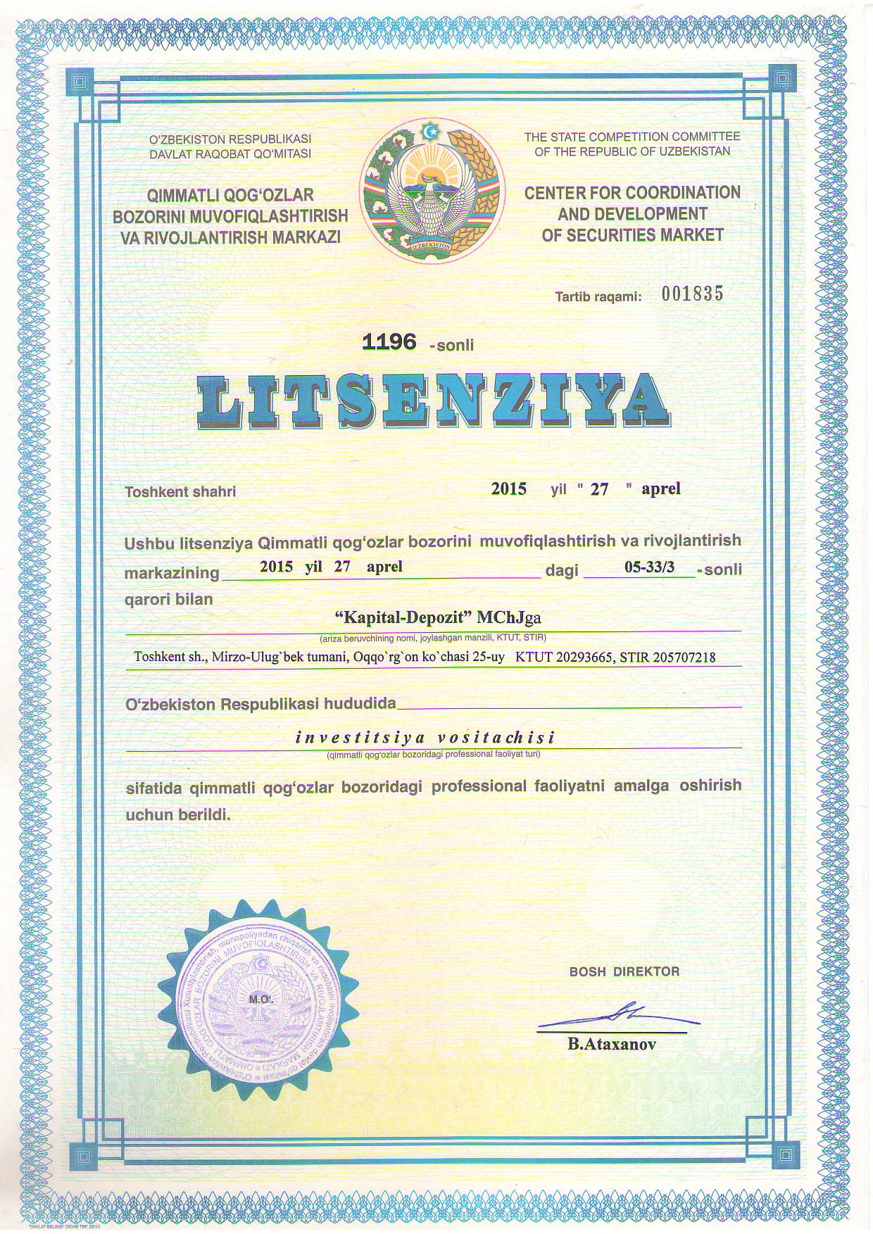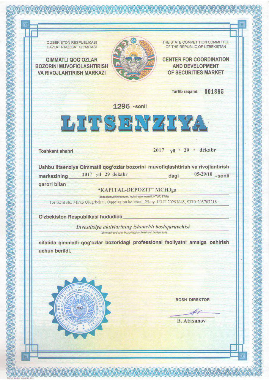 ООО «KAPITAL-DEPOZIT» был основан как депозитарий ценных бумаг во главе с Фаррух Ходжаевым